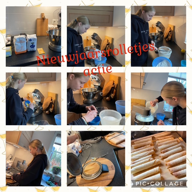 Voor mijn eerste masteractie heb ik tijdens de feestdagen nieuwjaarrolletjes gemaakt en verkocht. Net voor de kerstvakantie ging ik langs de deuren om te vragen of mensen ook wel nieuwjaarrolletjes wilden kopen. Tijdens de vakantie, op 29 en 30 december, heb ik die rolletjes gemaakt met mijn zusje, mijn moeder en een vriendin. Op 30 december ging ik weer langs de deuren om de rolletjes af te leveren. Ik heb wel 3,5 kilo meel gebruikt!